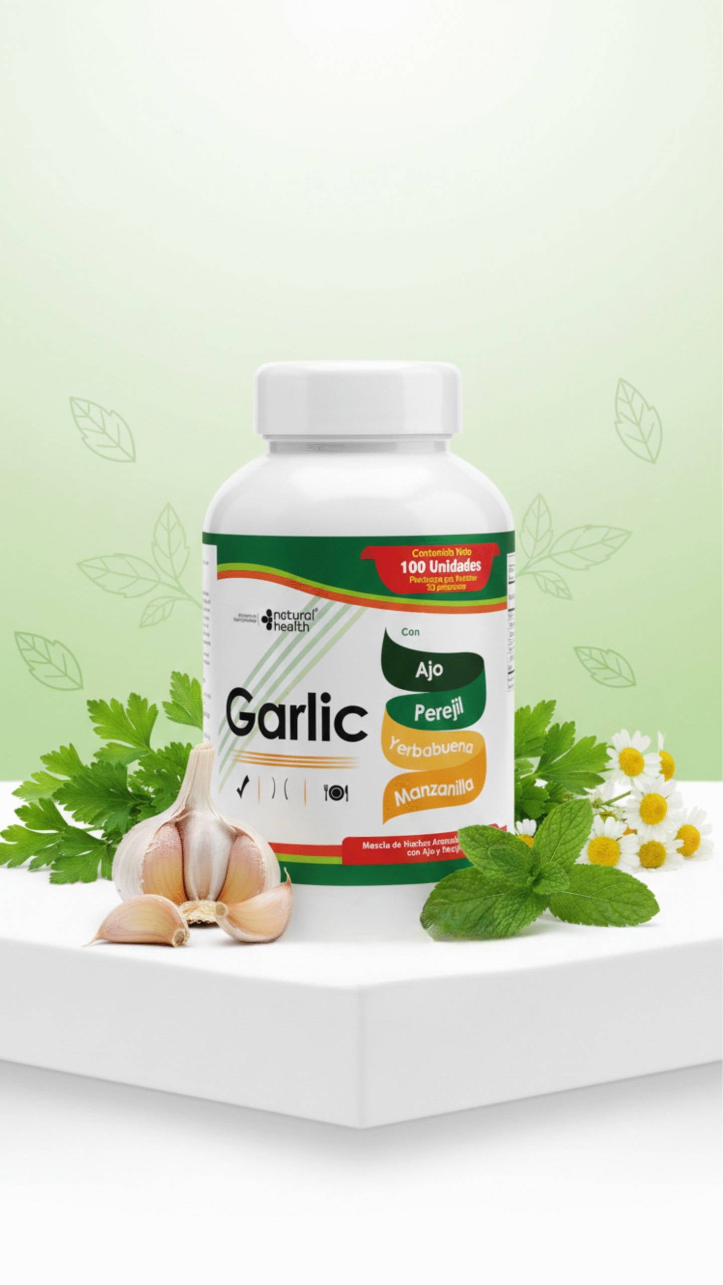 - Garlic con Ajo y Perejil es un suplemento diseñado para ayudar a regular la presión arterial y promover una salud cardiovascular óptima. La combinación de ajo y perejil, dos ingredientes naturales con propiedades beneficiosas, lo convierten en una opción atractiva para quienes buscan alternativas naturales para controlar la tensión.